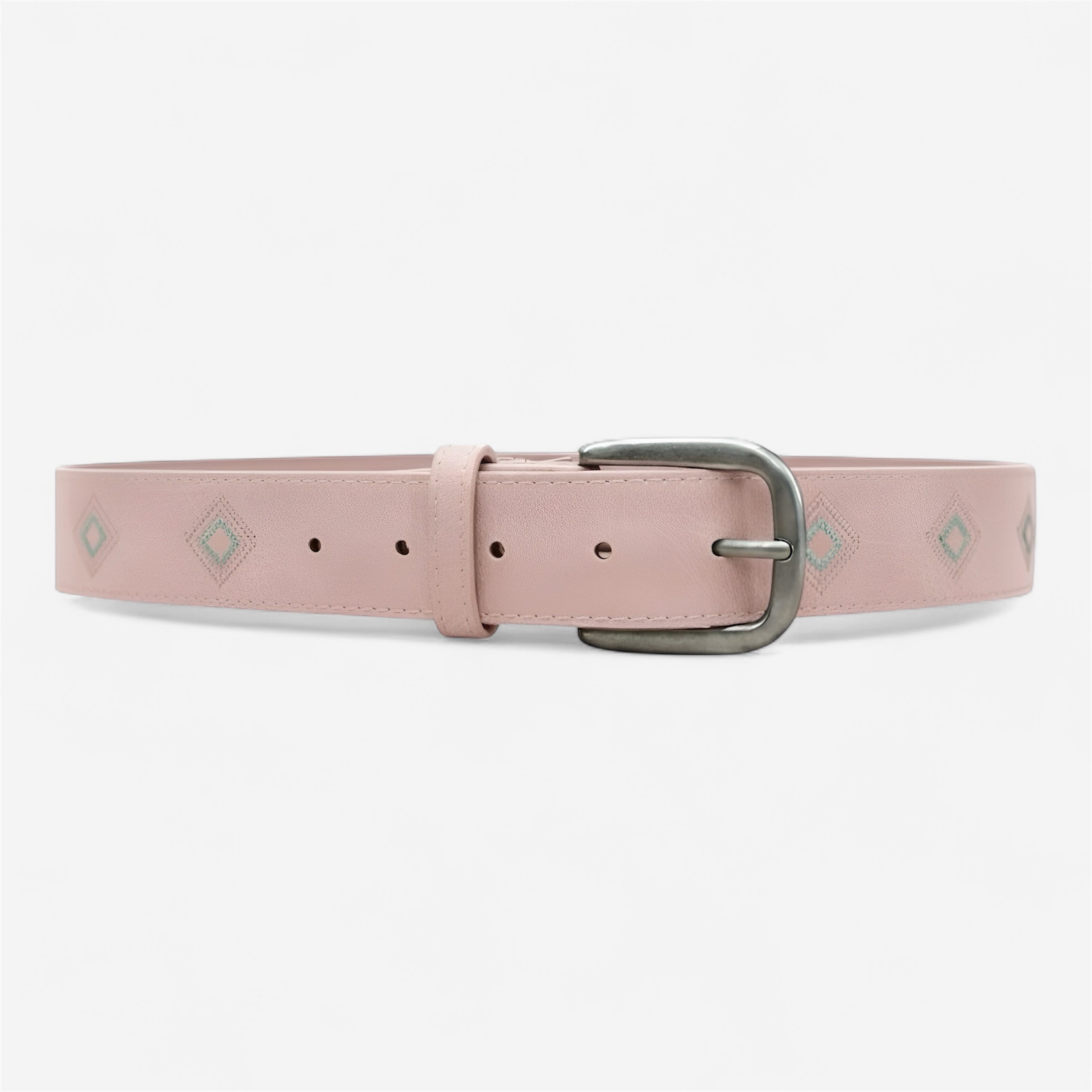 Cinturón de correa con bordados geométricos en color rosa y turquesa.