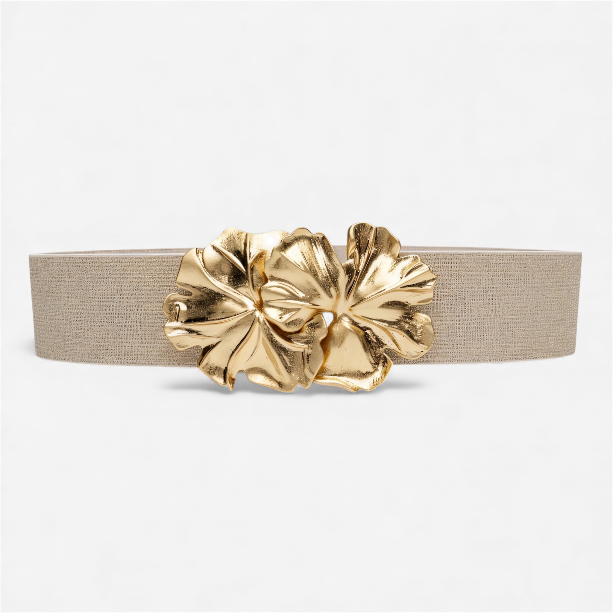 Cinturón elástico con hebilla en forma de dos hojas entrelazadas doradas que cierra en el frente.
