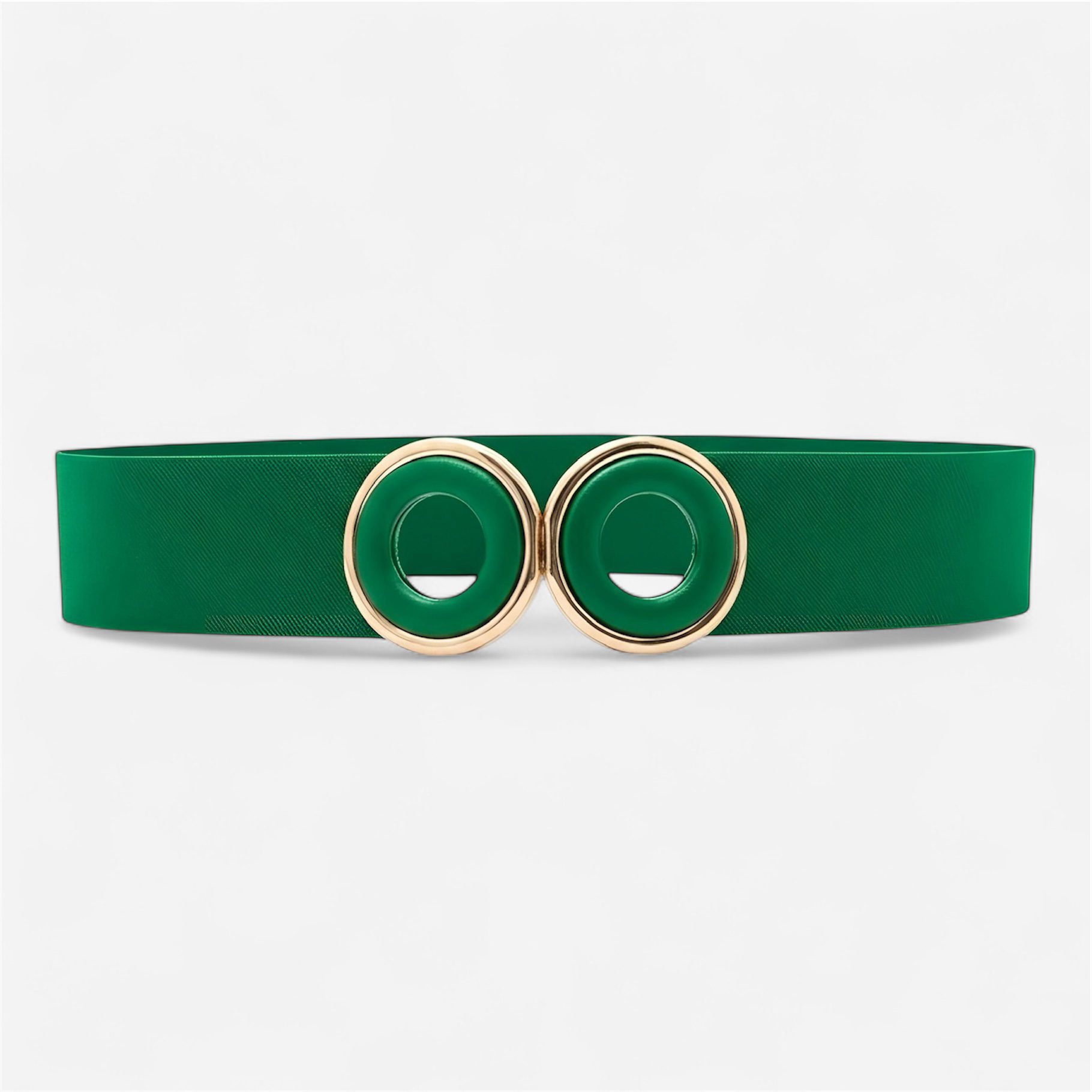 Cinturón elástico con hebilla frontal con dos formas ovaladas con cierre en la parte delantera.