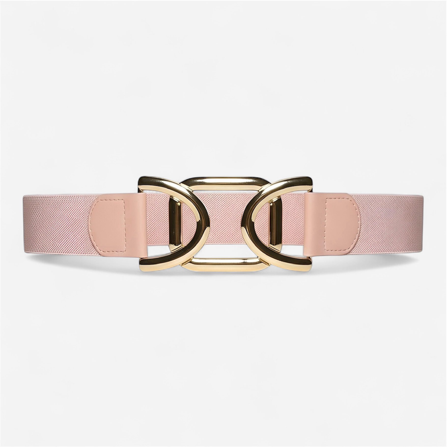 Cinturón elástico con hebilla frontal con tres formas geométricas donde se cierra.