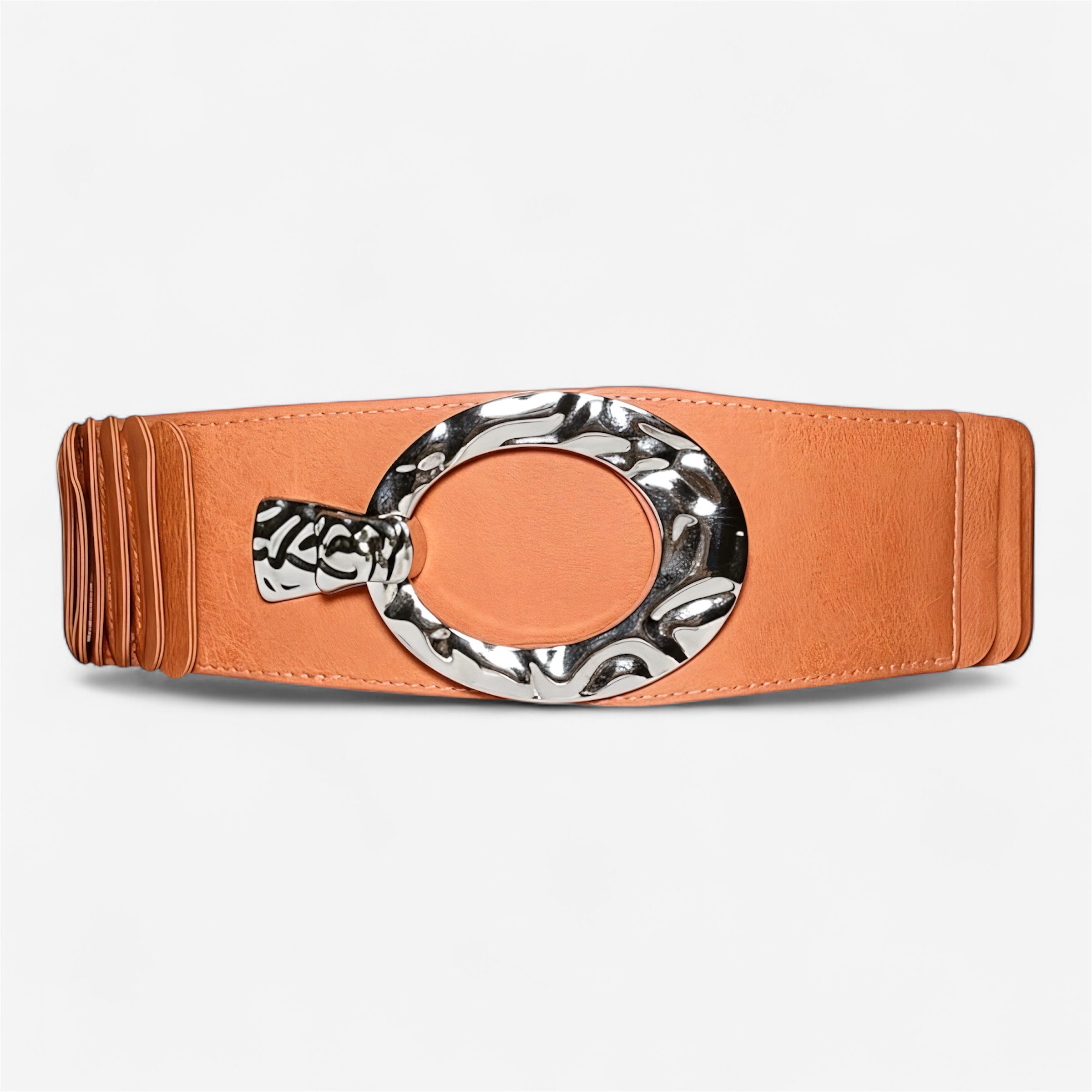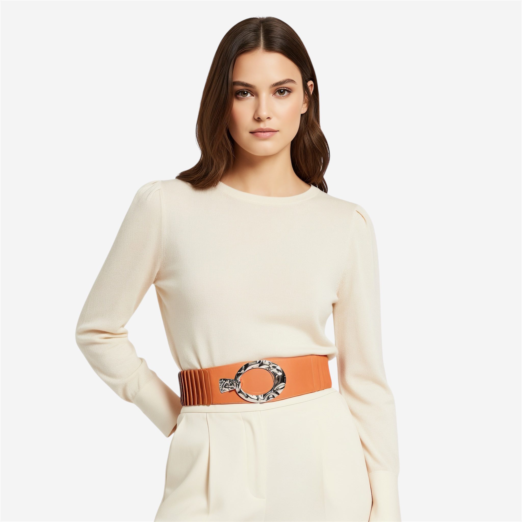 Cinturón elástico con hebilla alargada plateada que realiza el cierre en la misma.