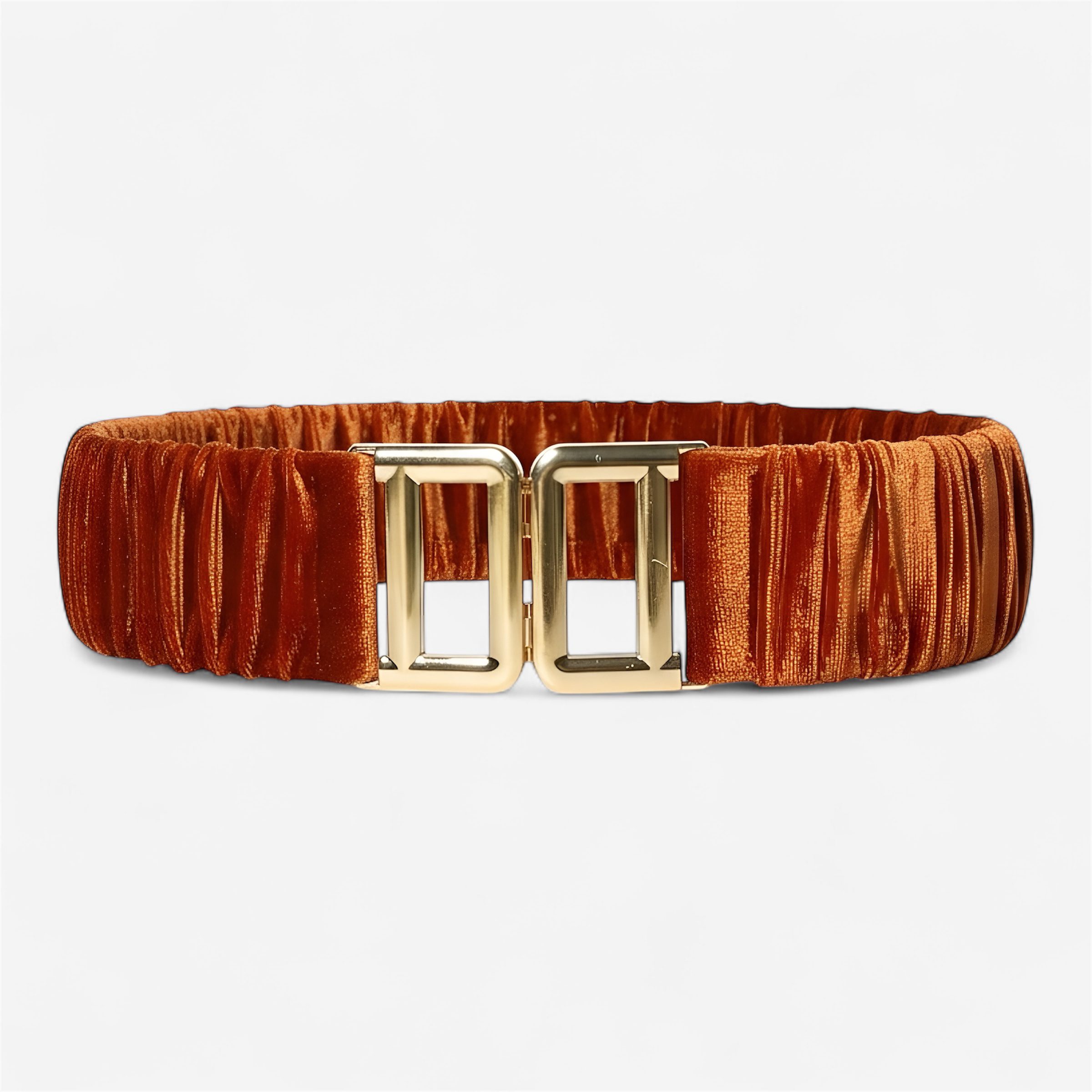 Cinturón elástico de terciopelo fruncido con hebilla dorada.